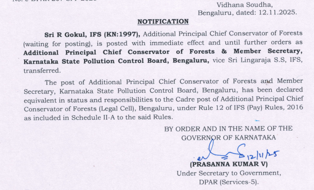 ಕೆಲವೇ ಕ್ಷಣಗಳ ಮುನ್ನ ಹೊರಬಿದ್ದ ಆದೇಶದಲ್ಲಿ ವಿವಾದಿತ ಐಎಫ್ ಎಸ್ ಅಧಿಕಾರಿ ಗೋಕುಲ್ ಅವರನ್ನು ಪರಿಸರ ಮಾಲಿನ್ಯ ನಿಯಂತ್ರಣ ಮಂಡಳಿಯ ಸದಸ್ಯ ಕಾರ್ಯದರ್ಶಿ ಹುದ್ದೆಗೆ ನಿಯೋಜಿಸಿ ಸರ್ಕಾರ ಆದೇಶ ಹೊರಡಿಸಿದೆ.ಇಷ್ಟು ದಿನ ಸದಸ್ಯ ಕಾರ್ಯದರ್ಶಿ ಯಾಗಿದ್ದ ಐಎಫ್ ಎಸ್ ಲಿಂಗರಾಜ್ ಅವರಿಗೆ ಹುದ್ದೆ ತೋರಿಸದೆ ವರ್ಗಾವಣೆ ಮಾಡಲಾಗಿದೆ.