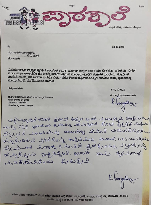 ನಾಳೆ ಬೆಂಗಳೂರಿನ ಪ್ರೆಸ್‌ ಕ್ಲಬ್‌ ನಲ್ಲಿ ಪಾಠಶಾಲೆ ಎನ್‌ ಜಿಓದ ಸಂಚಾಲಕ ಗಂಗಾಧರ್‌, ಚಿಕ್ಕಬಳ್ಳಾಪುರ ಕ್ಷೇತ್ರದ ಕಾಂಗ್ರೆಸ್‌ ಶಾಸಕ  ಪ್ರದೀಪ್‌ ಈಶ್ವರ್‌ ಅವರ ಮಾಲೀಕತ್ವದ  ಪರಿಶ್ರಮ  ನೀಟ್‌ ಮತ್ತು ಜೆಇಇ ಅಕಾಡೆಮಿ ಹೆಸರಿನಲ್ಲಿ ನಡೆಯುತ್ತಿರುವ ನೂರಾರು ಕೋಟಿ  ಶೈಕ್ಷಣಿಕ ದಂಧೆಯ  ಸ್ಪೋಟಕ ಮಾಹಿತಿಯನ್ನು ದಾಖಲೆಗಳ ಸಮೇತ ಬಿಡುಗಡೆಗೊಳಿಸಲಿರುವುದಾಗಿ ಪತ್ರಿಕಾ ಪ್ರಕಟಣೆ ಹೊರಡಿಸಿದ್ದಾರೆ.